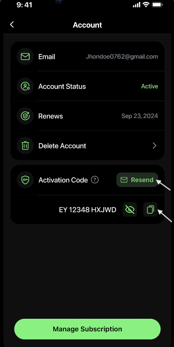 - Account Section (Logged-in iOS/Android/Mac Device): Go to Account Section → Activation Code